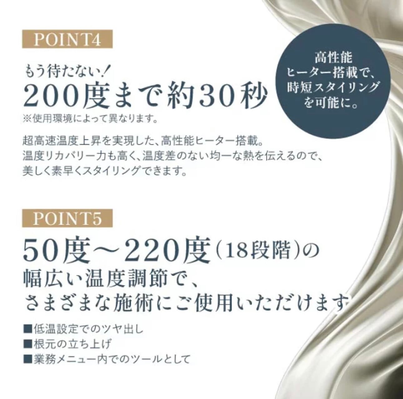 シルクプレートと最適な温度管理で、シルクのように美しく艶のある髪を短時間で仕上げることが可能です。